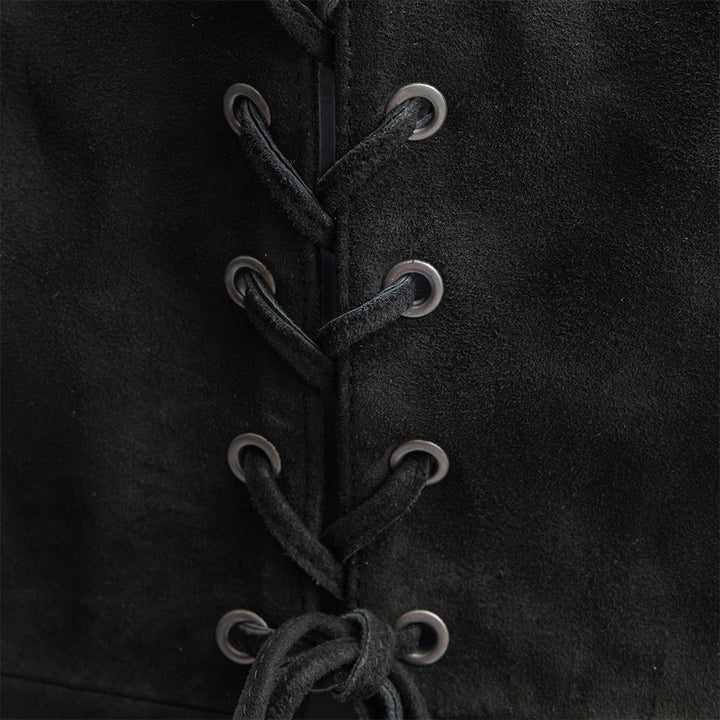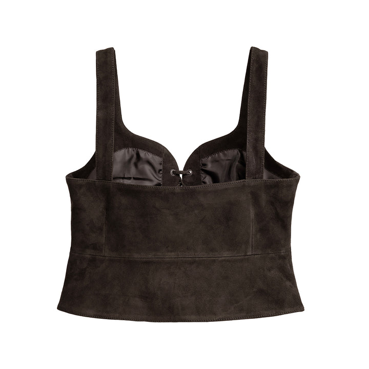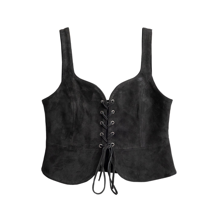 This lace-up peplum top, made of goat suede, combines soft refinement with contemporary edge. The lace-up front feature adds a touch of modern appeal, while the suede's natural drape and silky texture create a flattering, feminine silhouette.