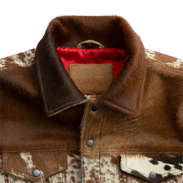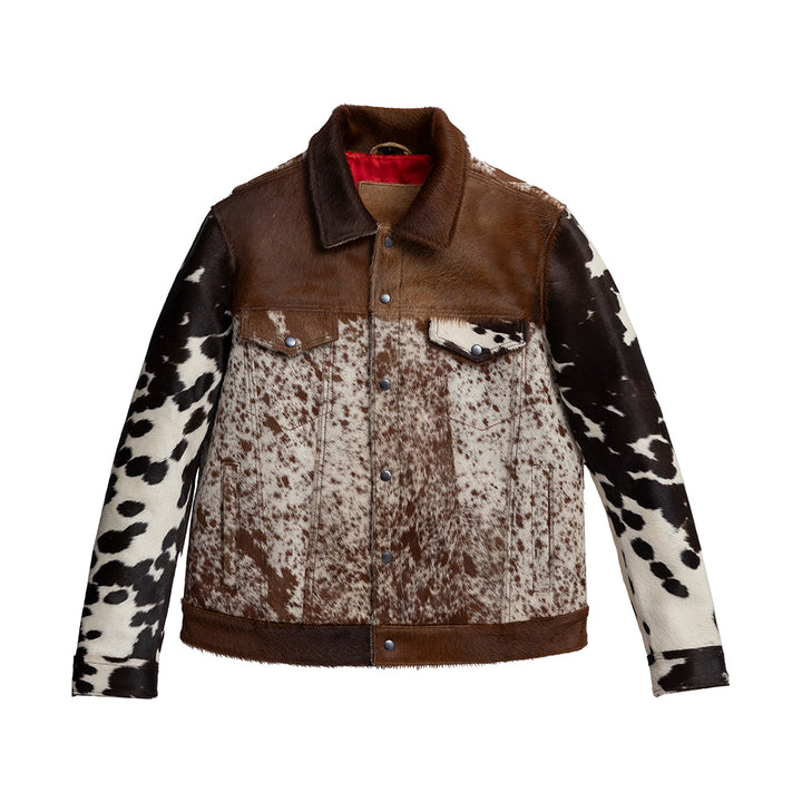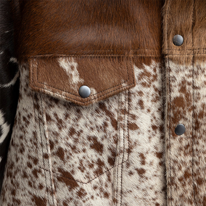 This Men’s Cowhide Cow Hair Pattern Leather Statement Jacket brings bold, runway-inspired style to contemporary wardrobes. Crafted from genuine hair on hide leather, it blends natural textures with striking pattern contrasts for a look that stands out effortlessly. The mix of rich brown tones and black and white speckled detailing creates a visually dynamic piece that makes any outfit feel elevated and fashion-forward.