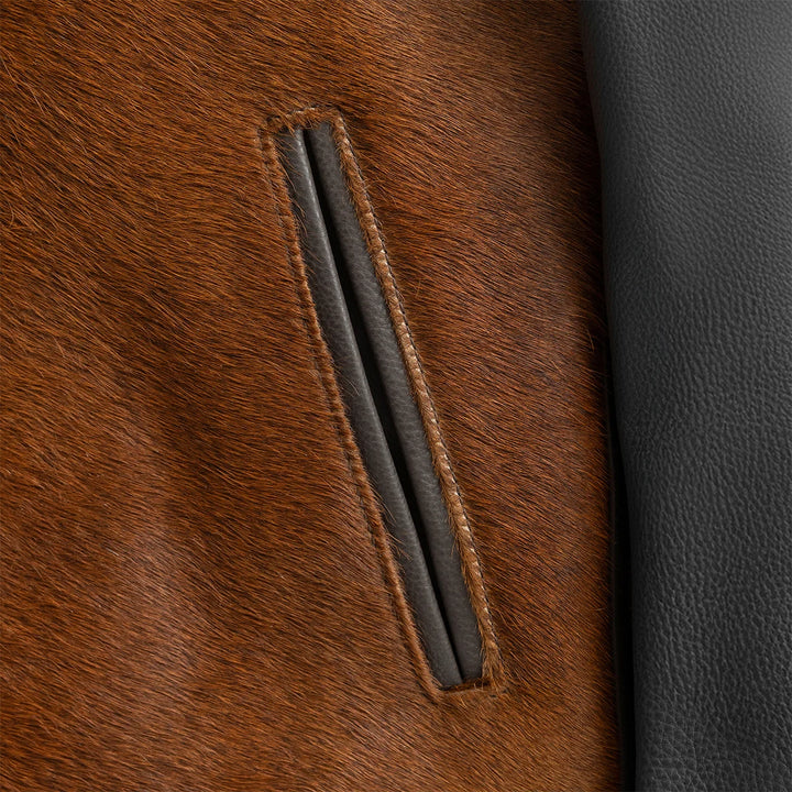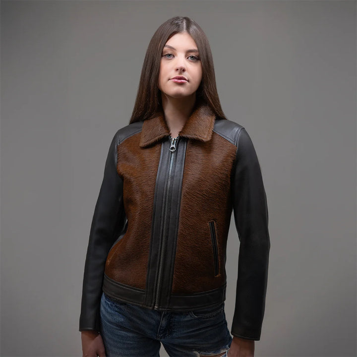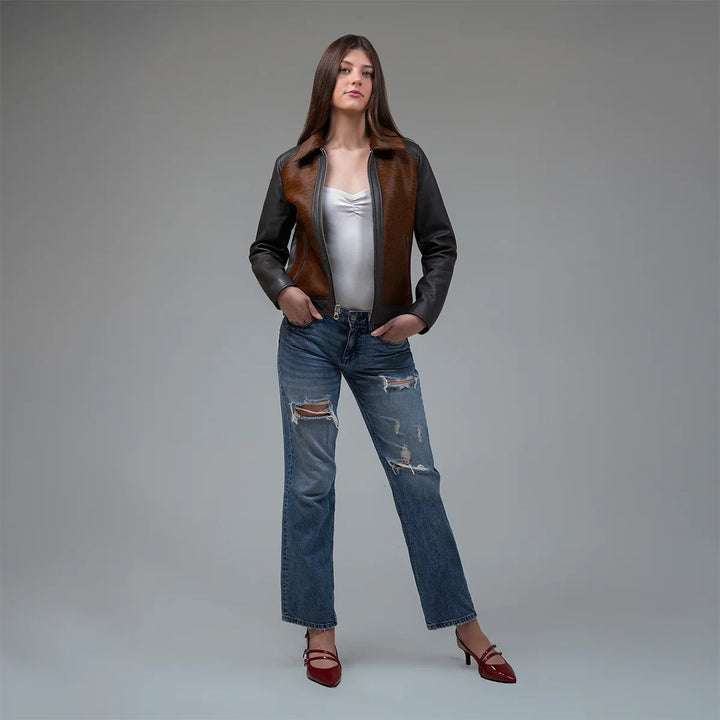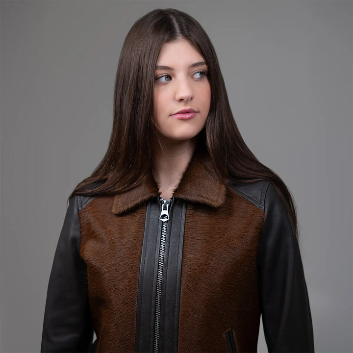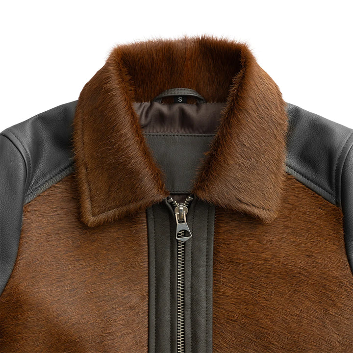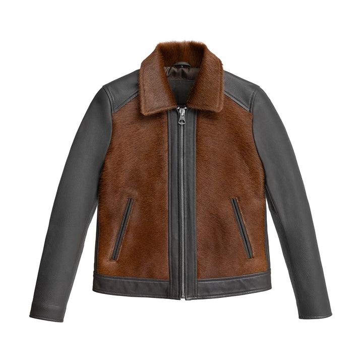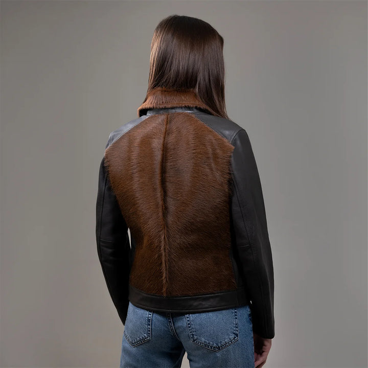 This Sheep Malibu Jacket is unique and easily fashionable, combining high-quality materials with contemporary style. It offers a distinctive blend of tenderness and striking character because it is made of soft sheepskin leather and features real cow hair embellishments.