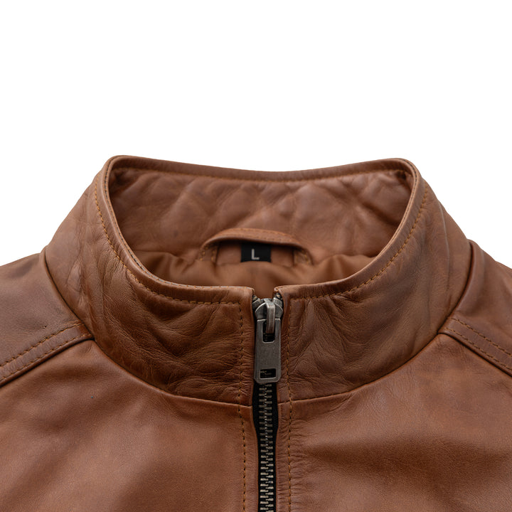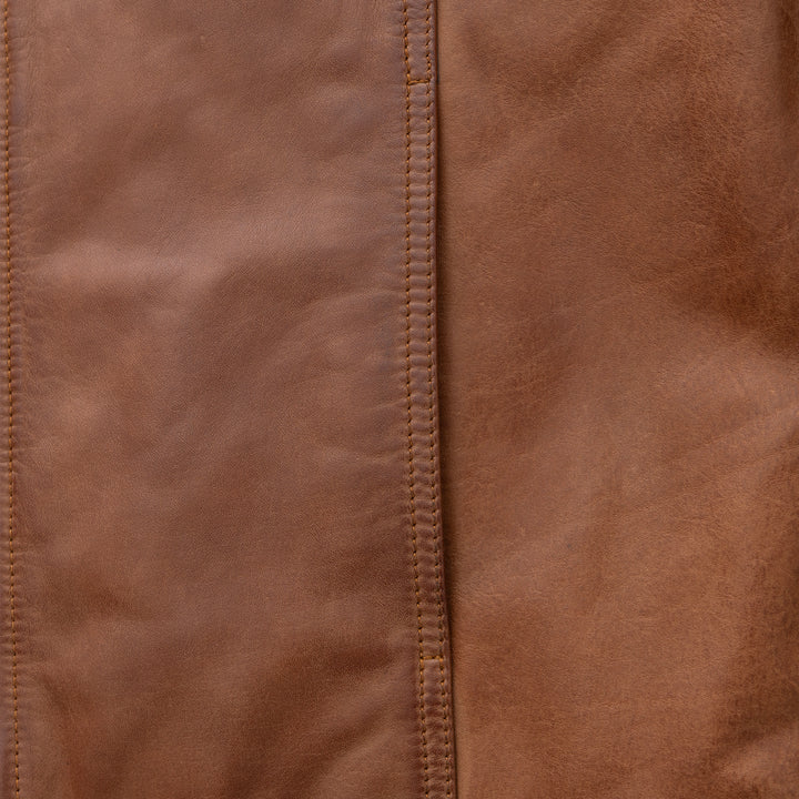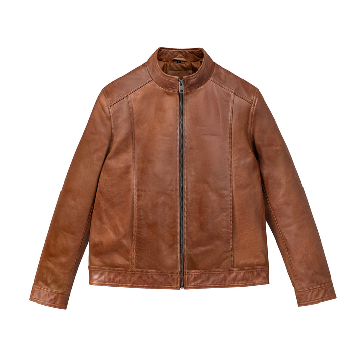 Carefully placed panel stitching enhances the jacket’s shape, giving it a tailored feel without compromising comfort. Its lightweight construction and soft inner lining make it ideal for layering over tees, knits, or button-downs across seasons. The warm tan finish pairs effortlessly with denim, chinos, and neutral tones, making it a wardrobe essential for men who prefer understated luxury.