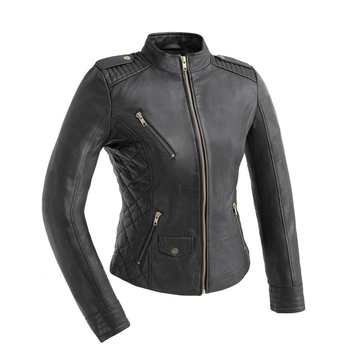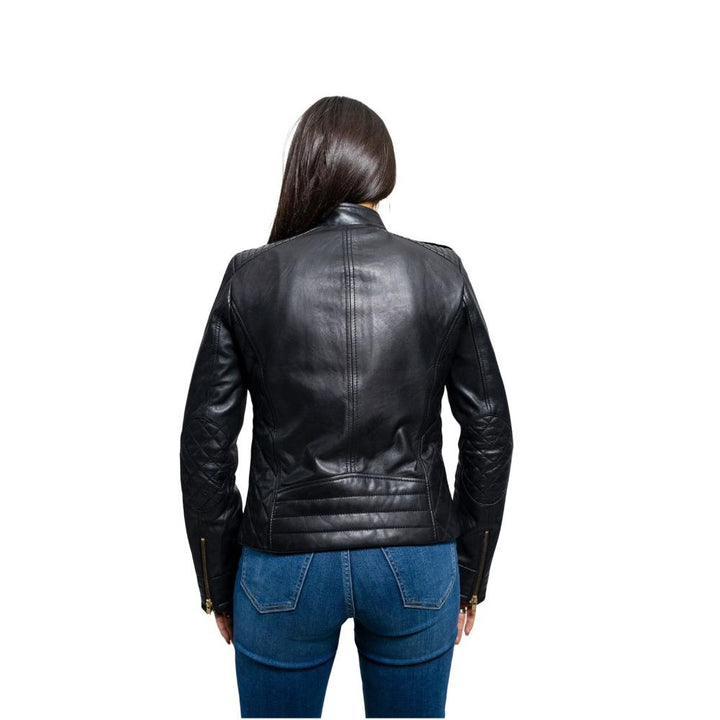 Madelin - Black Lambskin leather cut for an edgy moto look made with diamond-quilted accents on the elbows and waist silhouette that adds a luxurious feel to this gold hardware leather jacket. Wear this leather jacket to complete your edgy look while out to dinner, outdoor events, and those parties that are memorable.