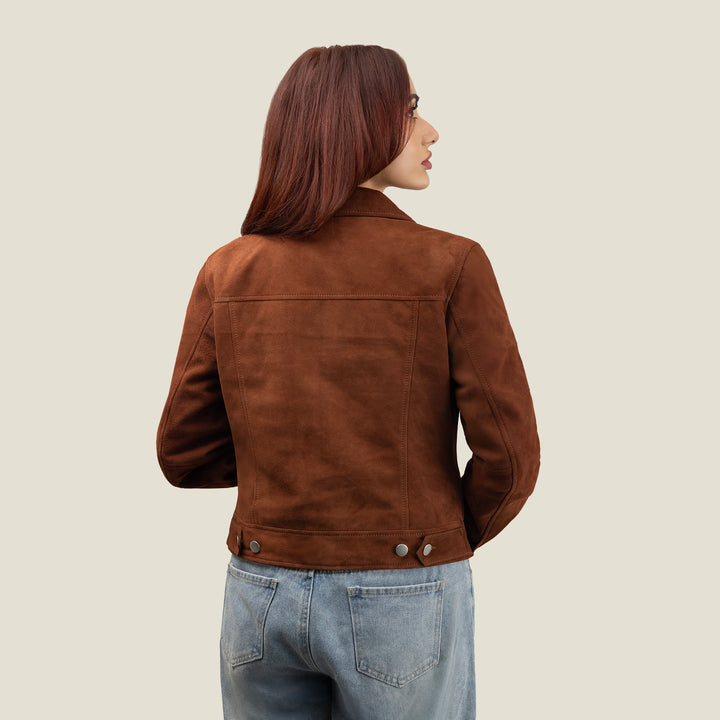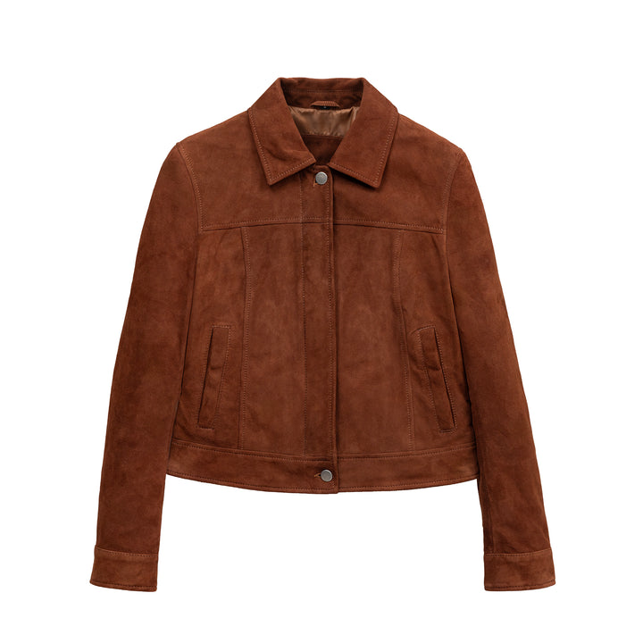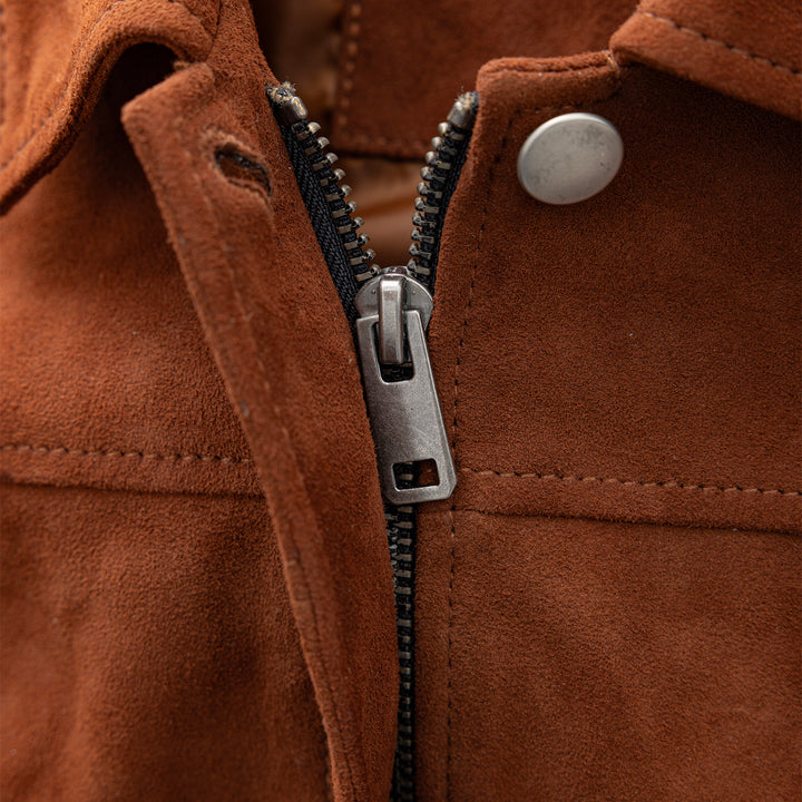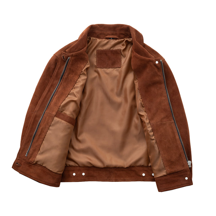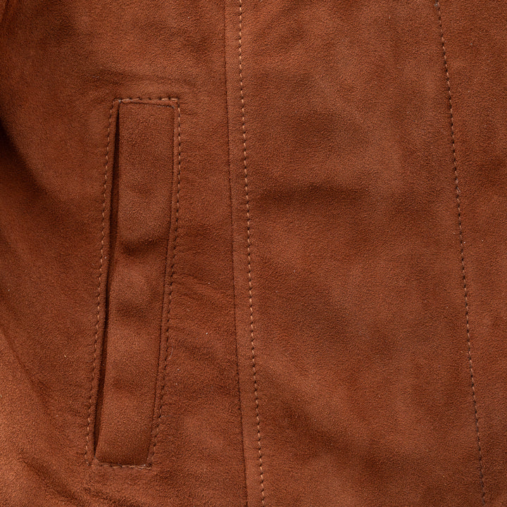 This jacket, which is made from super soft goat suede, blends classic style with contemporary utility. The suede's inherent texture is accentuated by the rich, dark cognac color, creating a warm, elegant appearance that only gets better with use.