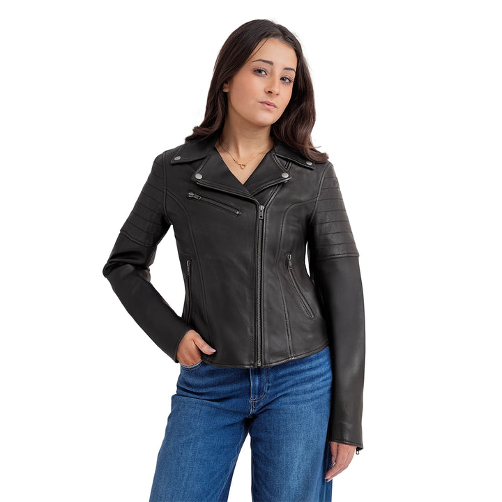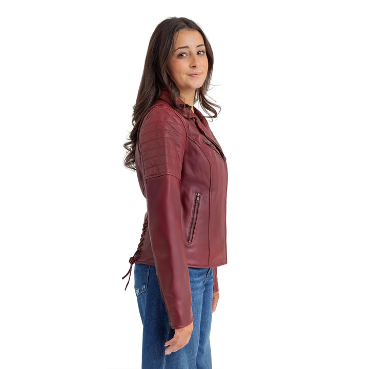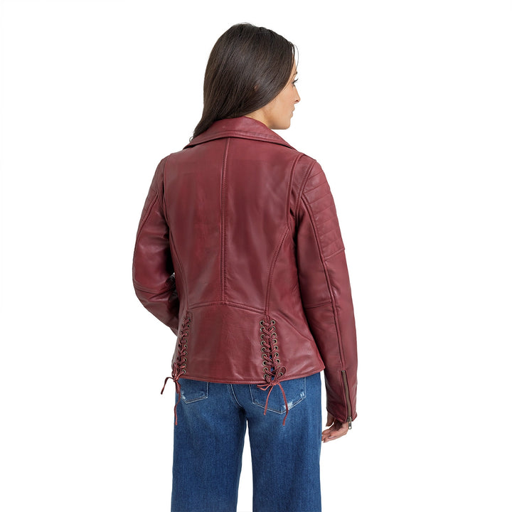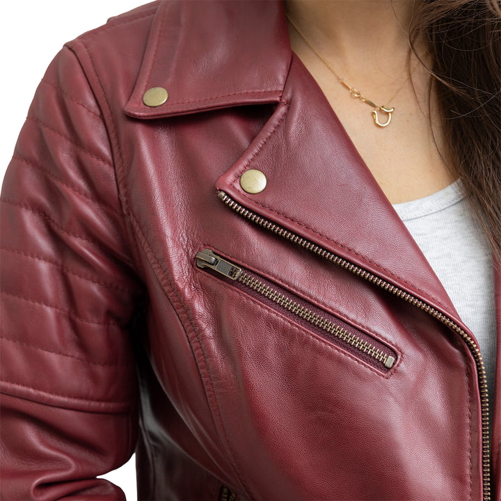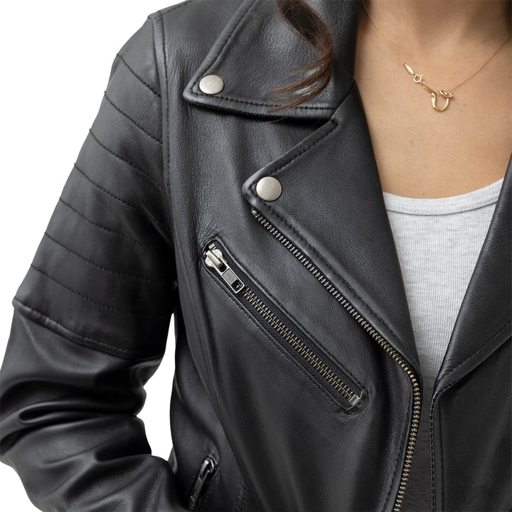 This traditional rocker-style jacket is expertly constructed from supple lambskin leather for a smooth, high-end feel. It offers equal amounts of comfort and attitude thanks to its classic fit design. Zip sleeves, a chest pocket, and two hand pockets are practical features that combine fashion and functionality. This jacket is made to last and comes with a lifetime warranty on all hardware. It is fully lined for comfort and durability. Oxblood is another option for a striking, unique appearance.