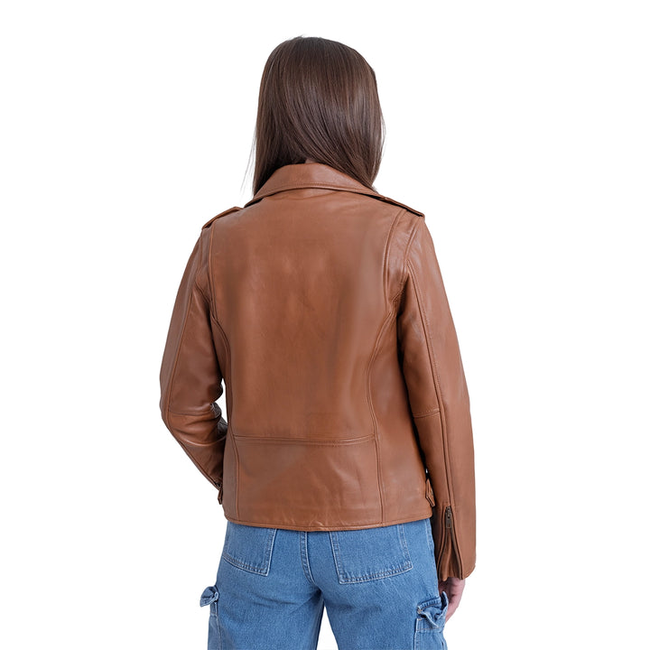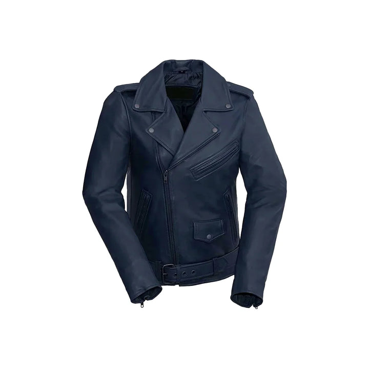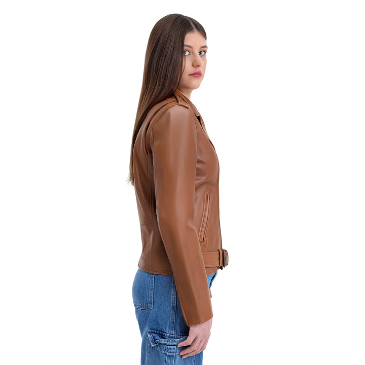 Iconic biker style is yours in this women's FMCo NY leather motorcycle jacket. Also available in Navy Blue, Oxblood, Whiskey and Oil Sand.